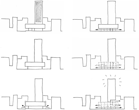 radikal geöffnet. Er wird Entkleidet. Von den untersten 15 Metern des Hochhauses bleibt nur die nackte